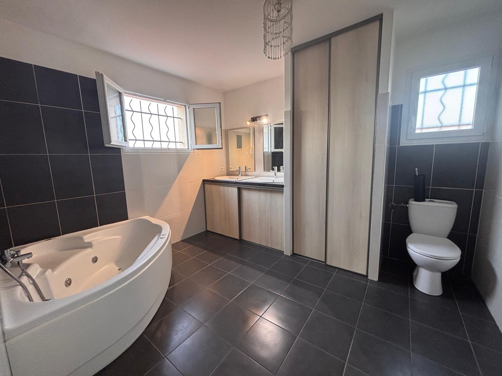 À l’étage, l’espace nuit se compose de trois chambres avec placards intégrés, dont une chambre dotée d’un dressing séparé. S’ajoute une salle de bains moderne, équipée d’un WC, d’un double vasque et d’une fenêtre.